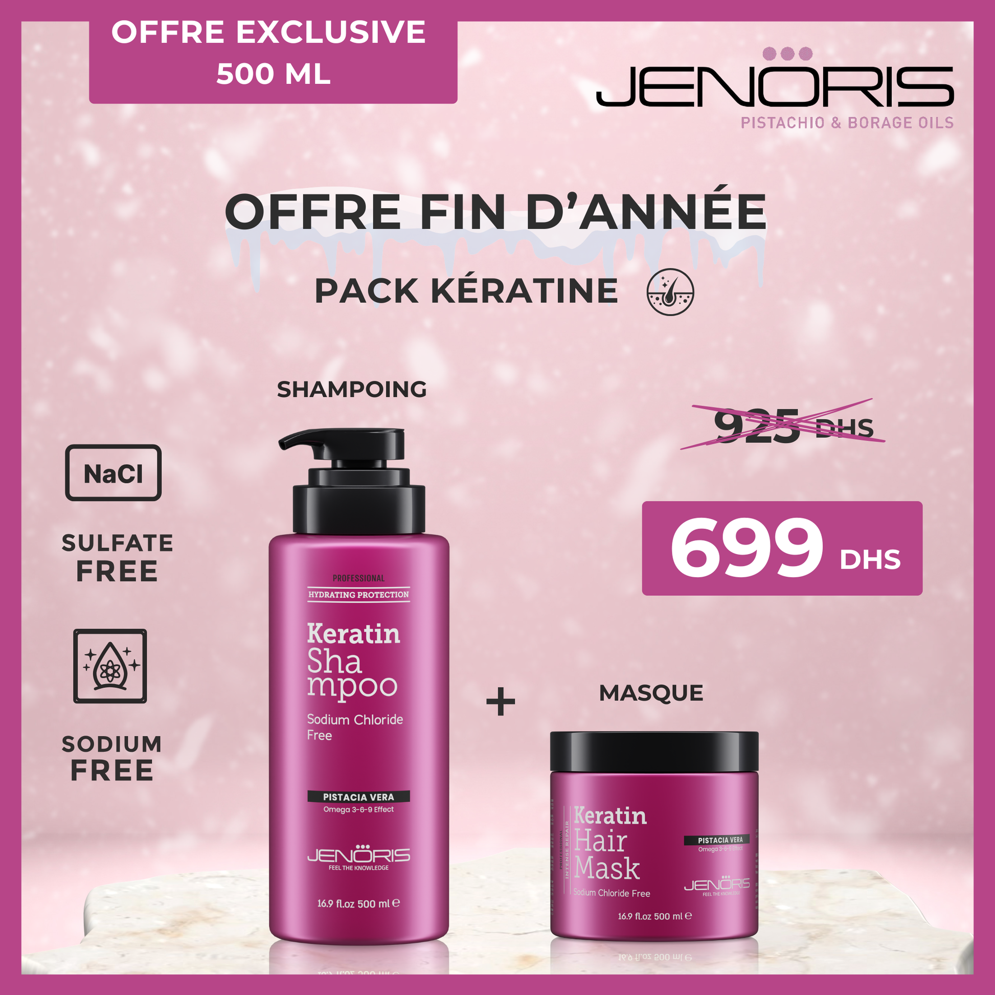Le Pack Kératine Jenoris associe le Shampoing à la Kératine et le Masque Capillaire à la Kératine, deux soins complémentaires formulés à base de kératine pure, spécialement conçus pour les cheveux secs, abîmés ou traités chimiquement (coloration, lissage, défrisage…).